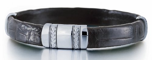An exotic crocodile cuff for him is combined with handsome hand crafted sterling silver. Accented by oxidized braid detailing.